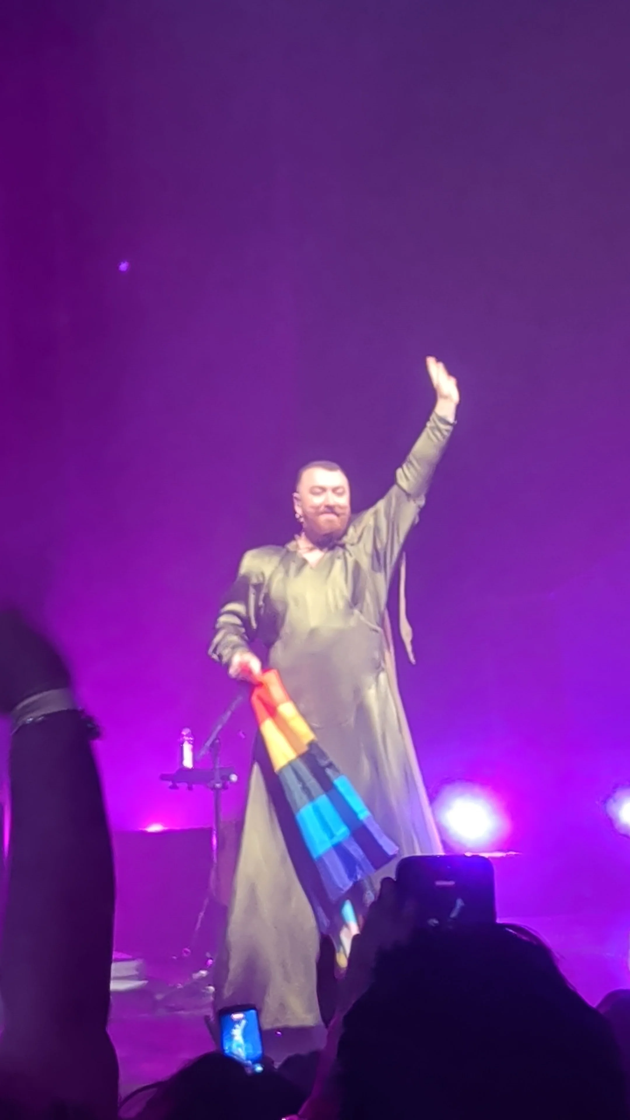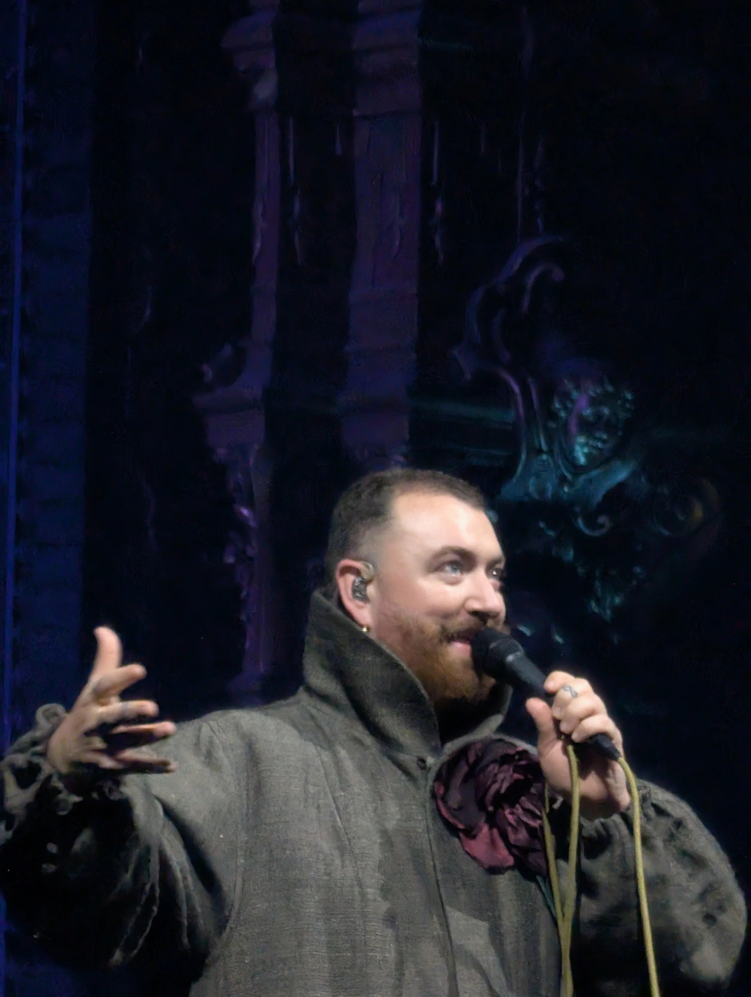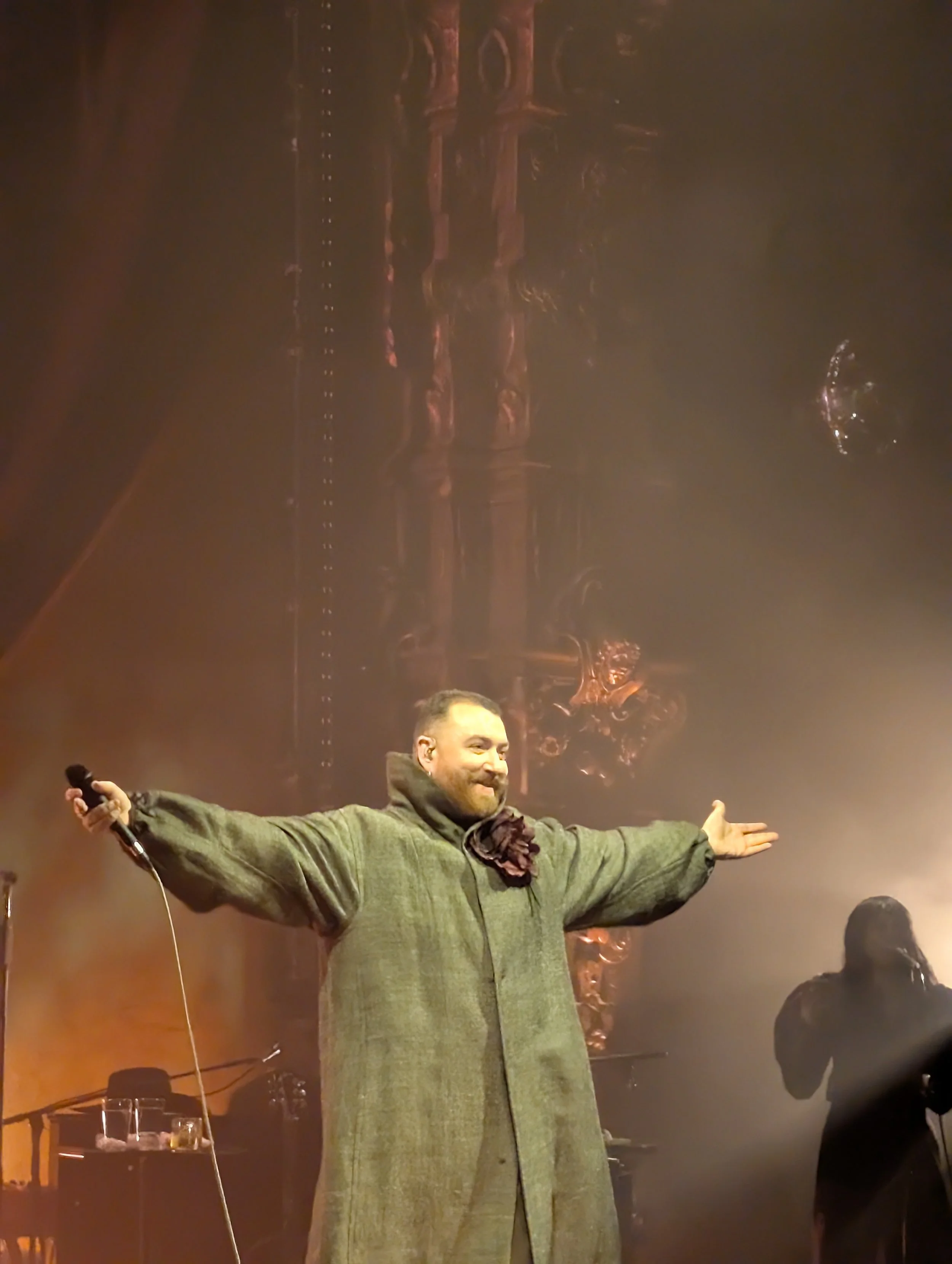 Donning a long, gray trenchcoat with a massive collar and an oversized rose on their left shoulder, Sam walked on stage to a huge roar from the crowd, singing one of their many hit songs, 2014’s “I’m Not the Only One.”